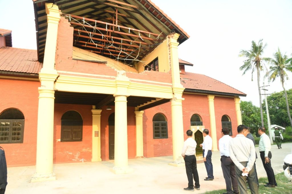 Subsequently, the Vice-Senior General and party inspected the Agricultural Machinery Department building (Cente-nary Building), the principal’s office, the Karamek Hall, the guesthouse, the Yinma Hall, the Tharaphi Hall, the Shwe Yaung Kyi Hall, and the classrooms. They issued instructions that before reconstructing the dam-aged classrooms, the ground conditions must be tested, and the buildings should be restored according to their original design.