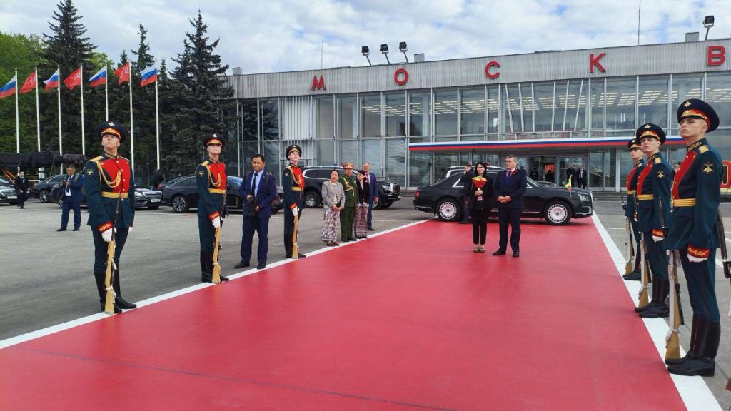 The Myanmar high-level delegation led by the Senior General arrived at Vnukovo International Airport in Moscow in the afternoon and was welcomed by Deputy Minister of Foreign Affairs Mr Andrey Rudenko and officials of the Russian Federation, Myanmar Ambassador to the Russian Federation U Thit Linn Ohn and Myanmar Military Attaché (Army, Navy and Air) Brig-Gen Kyaw Soe Oo.