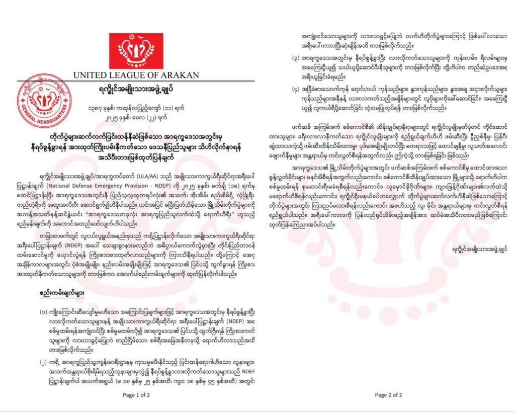 The statement noted that a small number of young individuals have been attempting to evade their responsibilities by misinterpreting the National Defense Emergency Provision (NDEP) enacted by the AA, without fully comprehending its implications. It also mentioned that regulations have been established for those currently trying to leave Rakhine State through various means.