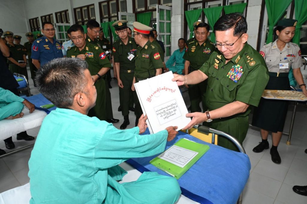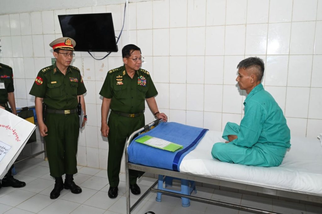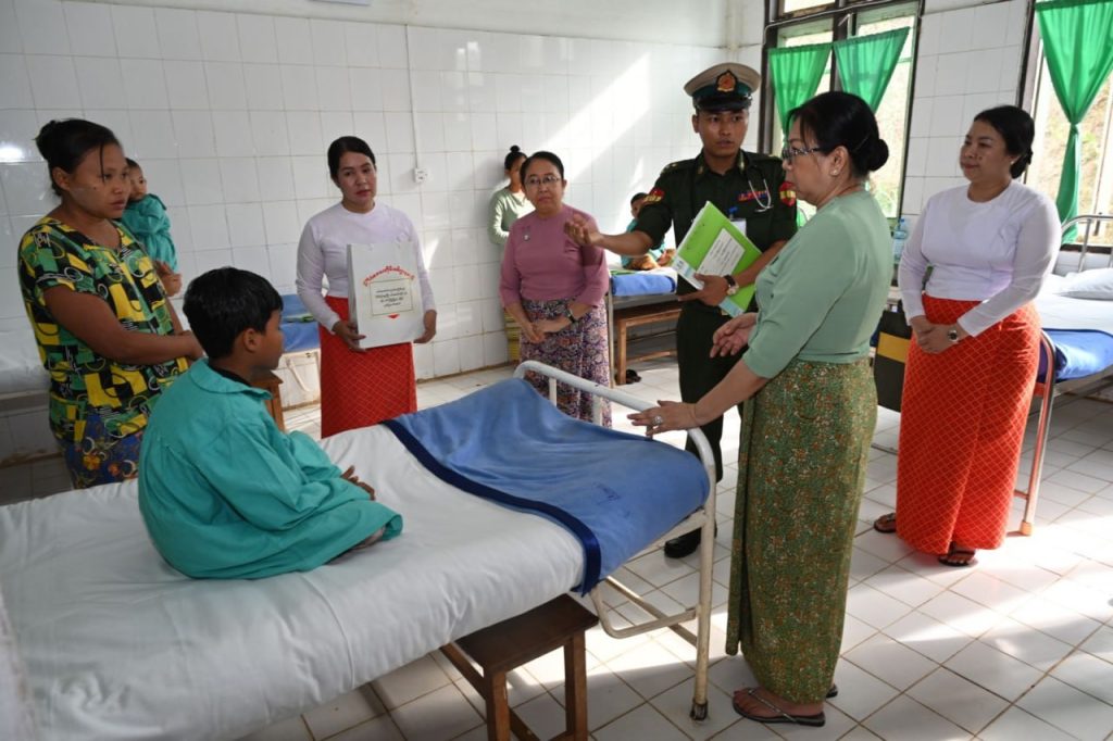 Later, the Senior General, his wife, and party visited the Kengtung Regional Military Hospital, where they met with officers, other ranks, their families, and local civilians receiving treatment. They inquired about each individual’s health, offered words of encouragement, and distributed food supplies.