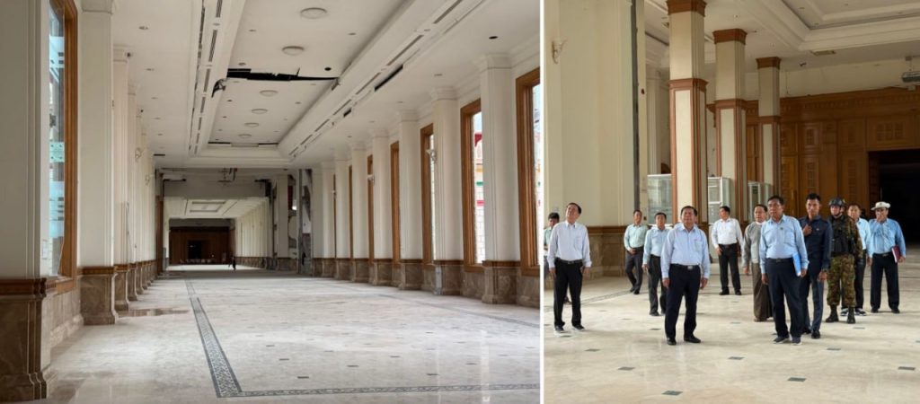 Chairman of the State Administration Council Prime Minister Senior General Min Aung Hlaing, accompanied by SAC Secretary General Aung Lin Dway, SAC Joint Secretary General Ye Win Oo and other members of the entourage, inspected the Hluttaw buildings in Nay Pyi Taw, Union Territory this afternoon, and ongoing restoration efforts following damage caused by the Mandalay earthquake. During the visit, he provided necessary guidance.