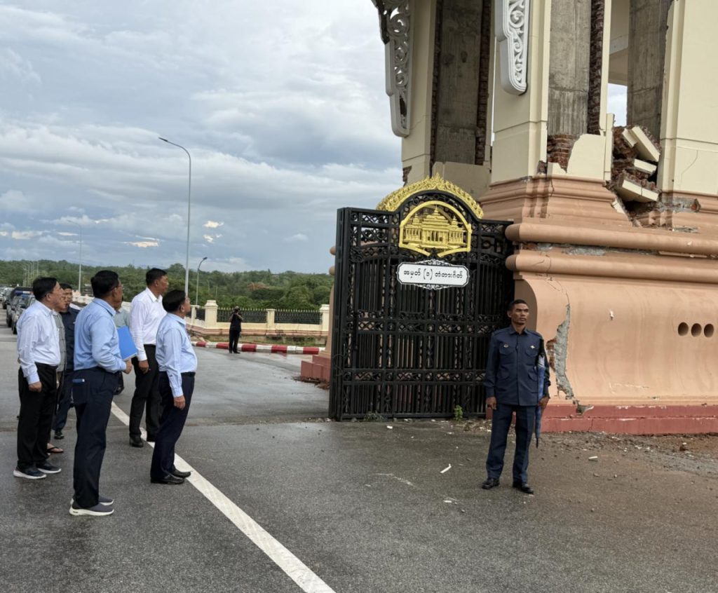 The Senior General first inspected the damage to the suspension bridge and archway at Gate No. 1, as well as the Pyidaungsu Hluttaw Building, the Pyithu Hluttaw Building, the Zabu Thiri Hall, and the Amyotha Hluttaw Building. He was accompanied by Pyithu Hluttaw Speaker U T Khun Myat and other officials during the inspection.