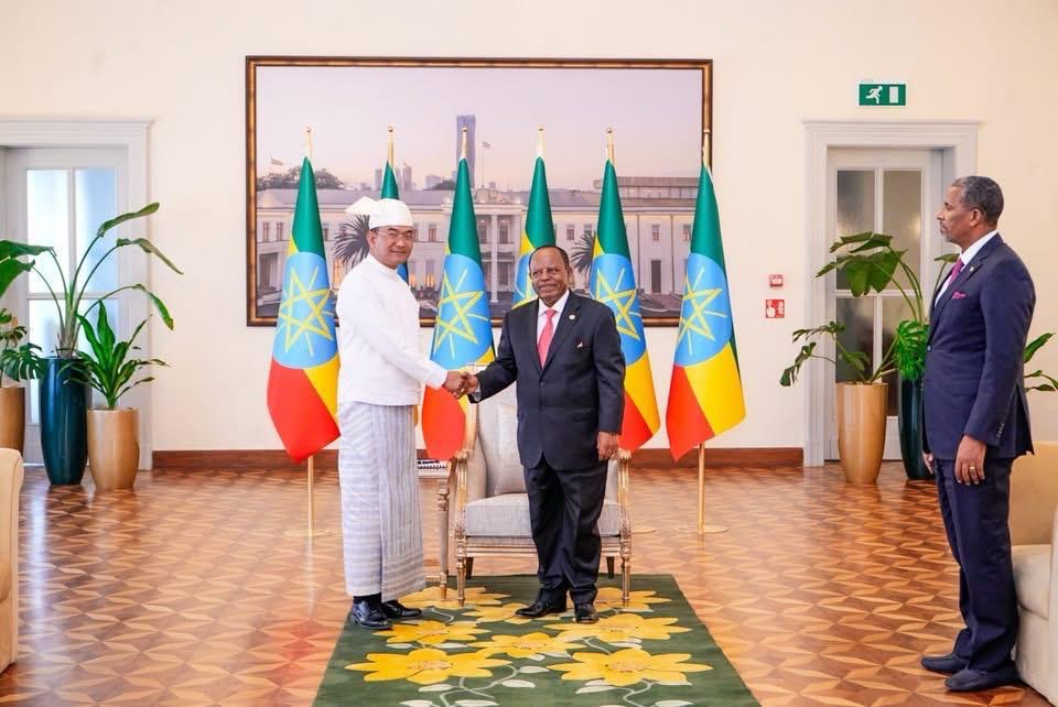 U Aung Min Oo, Ambassador Extraordinary and Plenipotentiary of the Republic of the Union of Myanmar to the Federal Democratic Republic of Ethiopia, presented his Credentials to Mr Taye Atske Selassie, President of the Federal Democratic Republic of Ethiopia on 3 June 2025 at the Grand National Palace in Addis Ababa. #Credentials #Ethiopia #Myanmar #mtnews