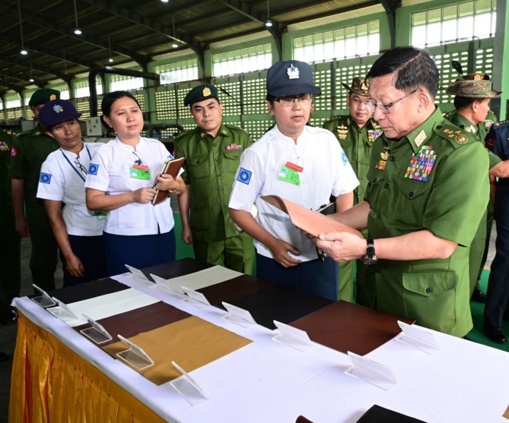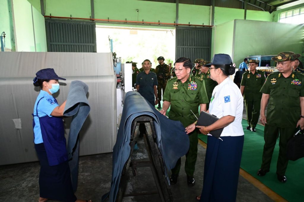 Chairman of the State Administration Council Commander-in-Chief of Defence Services Senior General Min Aung Hlaing, accompanied by an entourage of senior military officers from the Office of the Commander-in-Chief, the commander of Central Command and officers, inspected the operations of Tatmadaw Leather Factory (Meiktila) in Meiktila Station this afternoon.
