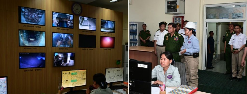 Chairman of the State Administration Council Commander-in-Chief of Defence Services Senior General Min Aung Hlaing, accompanied by his entourage, the Mandalay Region chief minister, the commander of Central Command and officials, inspected the boosted production of the Tatmadaw Textile and Garment Factory (Meiktila) and No. 3 Cement Factory (1,200 tons) this morning.