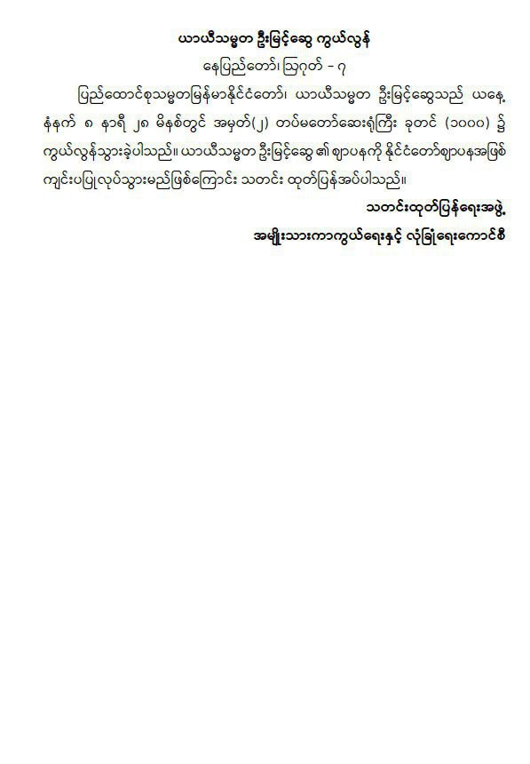 Interim President U Myint Swe passed away today, August 7, at 8:28 a.m. at the No. 2 Military Hospital (1,000 beds), the National Defense and Security Council announced.