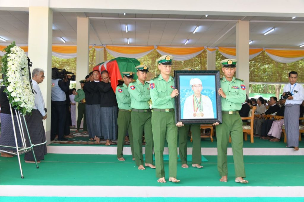 The Chairman of the State Security and Peace Commission read out the gazette order of the National Defence and Security Council, after which the order was placed inside the coffin containing the remains of Pro Tem President U Myint Swe.