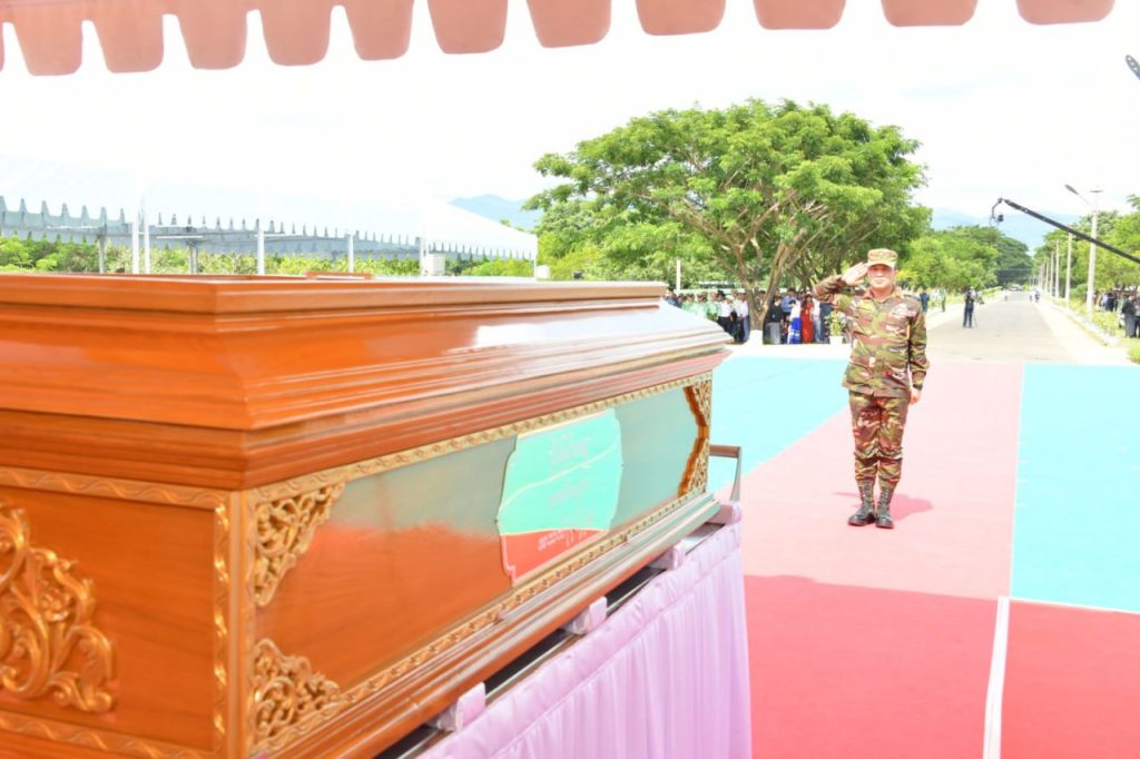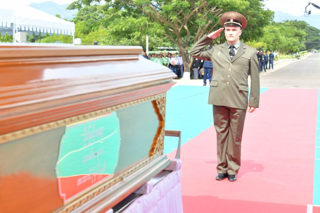 Eight Union Ministers con-veyed the remains onto the artillery carrier to send it to the Tatmadaw Military Cemetery (Nay Pyi Taw). Meanwhile, the Guard of Honour saluted the remains and conducted other funeral conveyance procedures.