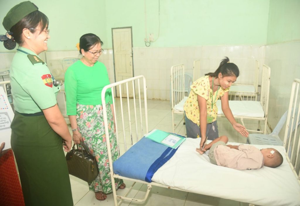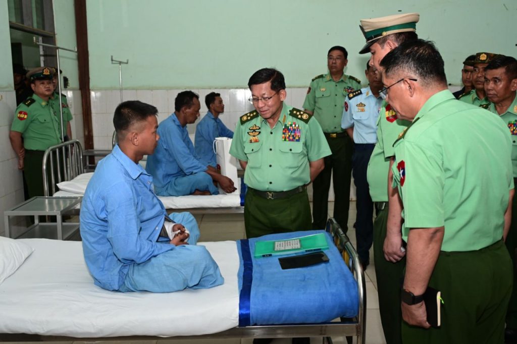 Afterward, the Senior General visited the local military hospital, meeting with officers, other ranks, militia members, and Myanmar Police Force personnel who were injured while performing national defense and security duties. He inquired about their injuries and recovery progress, offered words of encouragement, and address-ed their needs.
