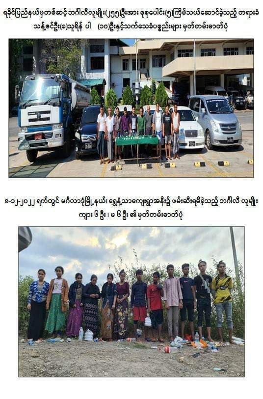 According to the investigation, Thant Zin Oo (a) Thurein, who arranged the trafficking, Myat Soe Oo (a) Pyaung Gyi, Htet Kyaw, Aung Thu, Myint Sein, Zaw Zaw Latt (a) Rakhine Lay, Kyaw Kyaw (a) Kyaw Gyi and Min Min Htike, who are drivers, Aye Khaing (a) Ko Aung, Aung Aung, Zaw Aung (a) Maung Zaw and Zaw Win (a) Ali Bai, who received the smuggled Bengalis were arrested.