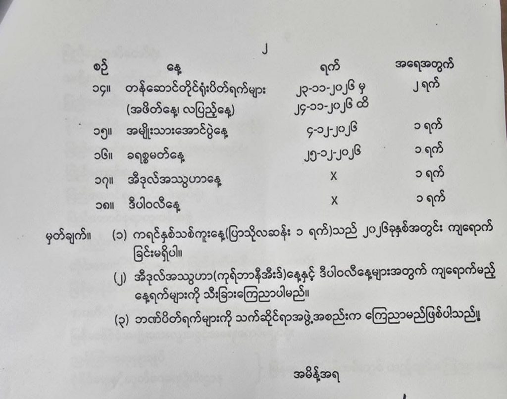 In 2026, a total of (32) days of holidays have been set, including Myanmar New Year holidays and Thadingyut holidays.