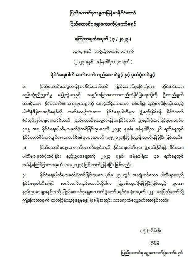 The Union Election Commission released the By-laws for Registration of Political Parties. Those who want to establish a political party in accordance with the Law and By-laws can apply in person at the Union Election Commission Office No. (22) in Nay Pyi Taw during office hours from the date of this announcement.