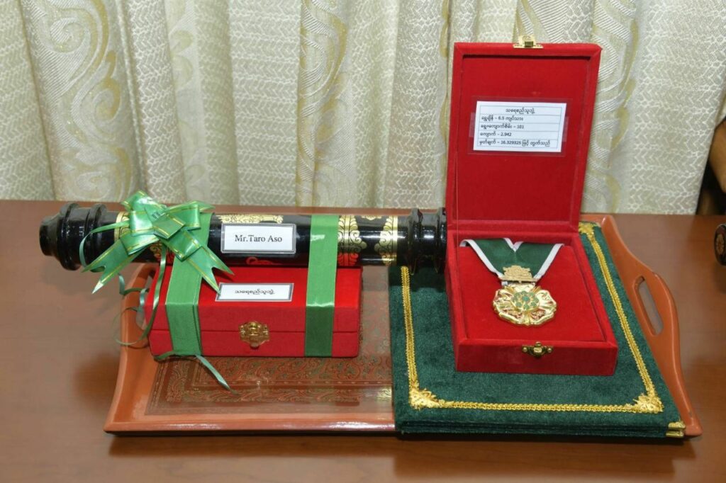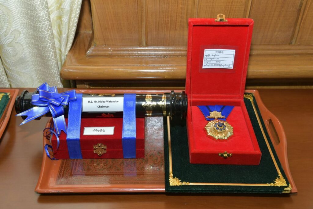Thray Sithu Title and insignia conferred on former Prime Minister Mr. Taro Asofor his brilliant contribution to peace, prosperity and progress of Myanmar was accepted by Mr. HIDEO WATANABE on behalf of the former Japanese PM.