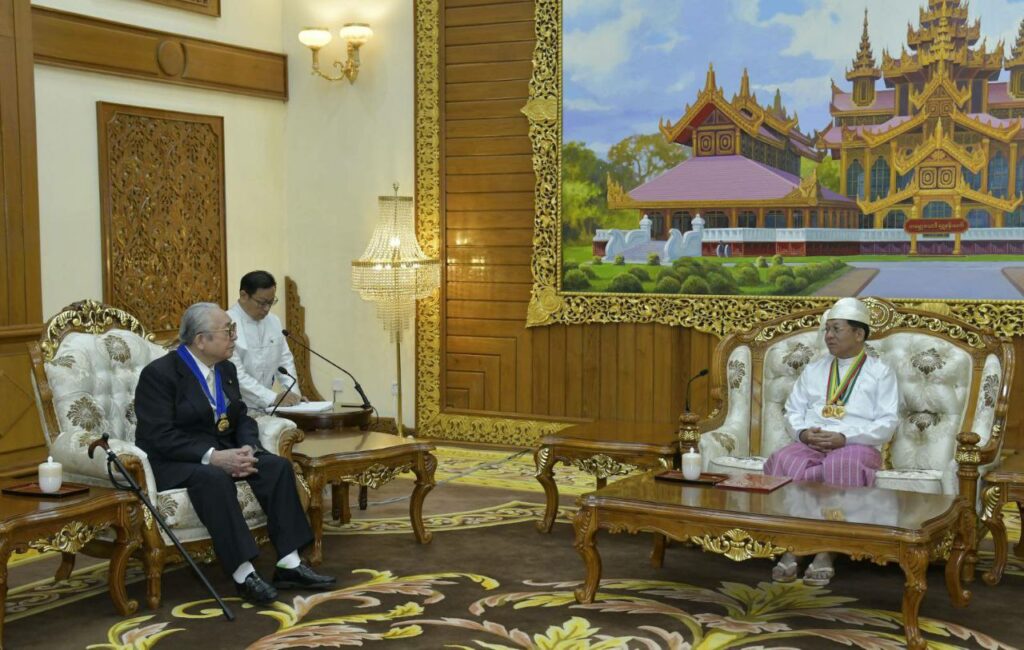 Honorary titles and insignias were also presented at the parlour of Bayintnaung Villa here today. Present were Chairman of State Administration Council Prime Minister Senior General Min AungHlaing and officials and Japan-Myanmar Friendship Association Chairman H.E. Mr. HIDEO WATANABEand officials.