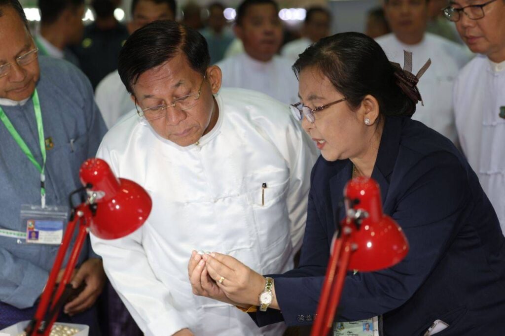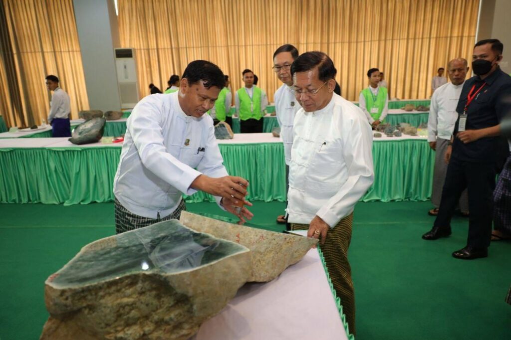 The Senior General was then conducted round the jade, gem and pearl lots displayed at the Mani Yandana Jade Hall for sale at the emporium by officials. The Senior General gave guidance.
