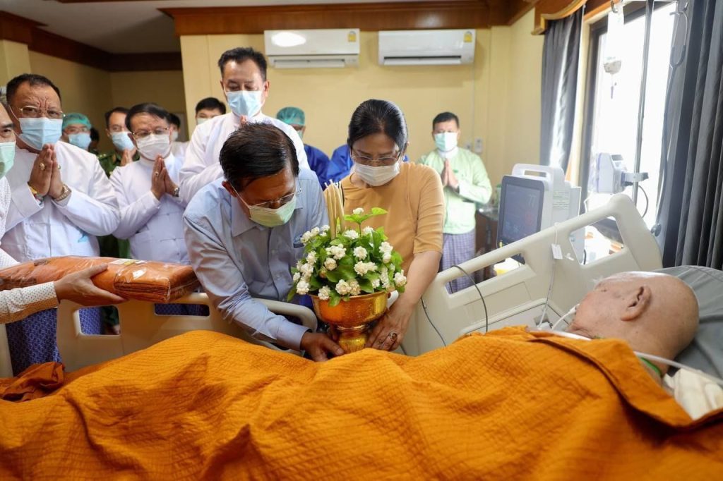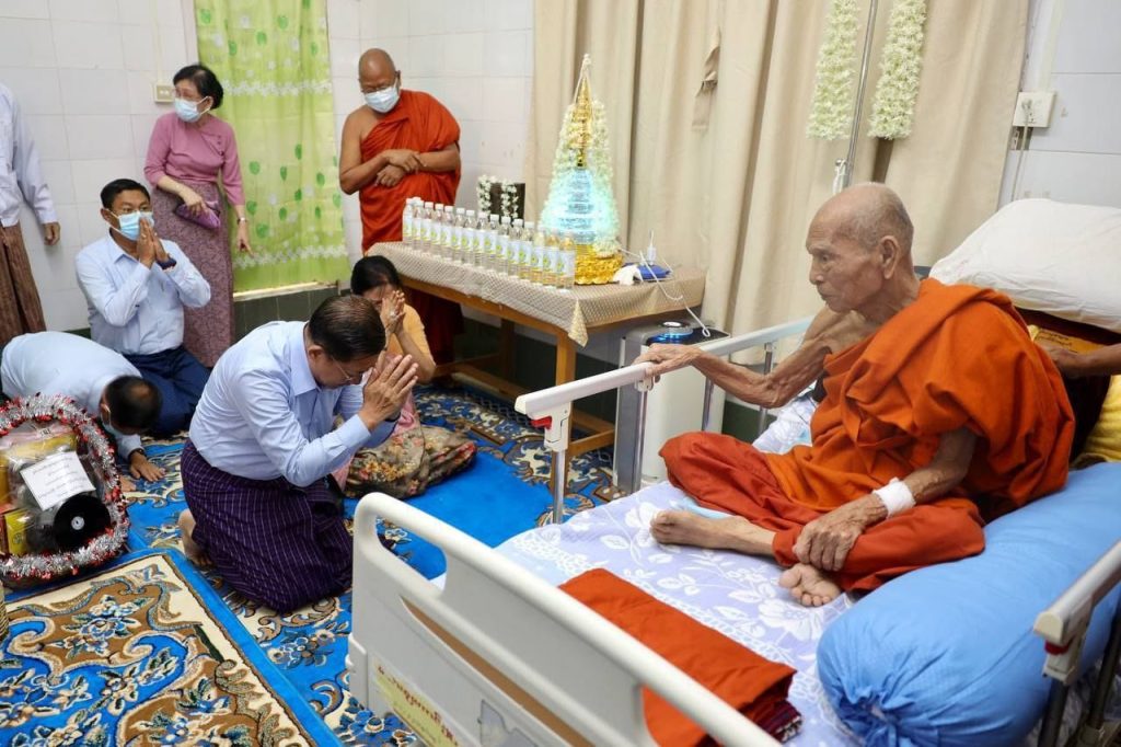 The Senior General and party paid respects to Chairman of State Sangha Maha Nayaka Committee Principal of Bhamo Monastery, Mandalay, Sayadaw Agga Maha Pandita Agga Maha Gandavacaka Pandita Abhidhaja Maha Rattha Guru Abhidhaja Maha Rattha Guru Abhidhaja Agga Maha Saddhammajotika Bhaddanta Kumarabhivamsa, who was receiving medical treatment at the General Hospital in Mandalay this morning.