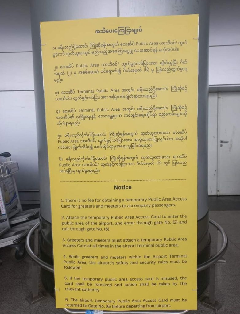 Those who see off passengers are allowed to to do so by temporary entry and exit cards, according to the Yangon International Airport.