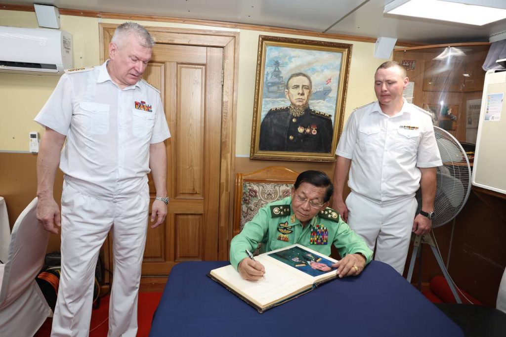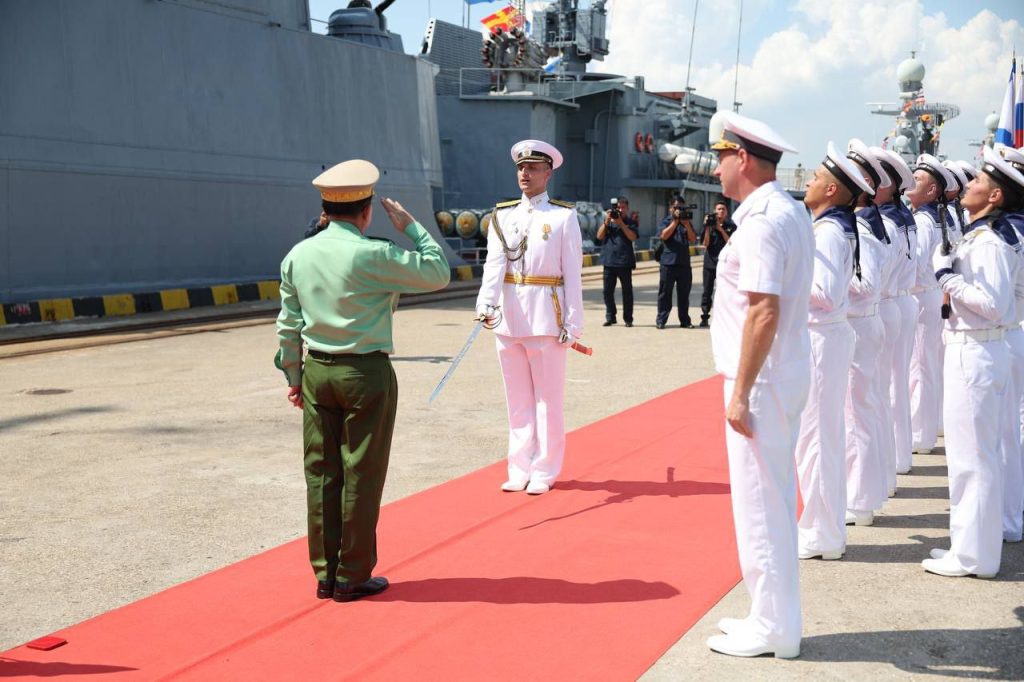 Chairman of State Administration Council Commander-in-Chief of Defence Services Senior General Min Aung Hlaing was welcomed with the guard of honour of the Russian Pacific Fleet by a delegation led by Russian Navy Commander-in-Chief Admiral Nikolai A.EVMENOV, who arrived in Myanmar to hold the 1th MYANMAR-RUSSIA MARITIME SECURITY EXERCISE (MARUMEX), this morning.