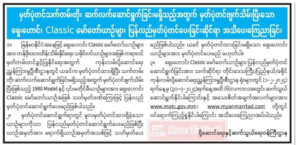 The announcement of Ministry of Transport and Communications stated that the re-registration of antique classic vehicles can be done at the Road Transport Administration Department of relevant regional/state/district within a period of 6 months from February 1 to July 31, and detailed information can be accessed at www.motc.gov.mm and www.myanmarrtad.com.