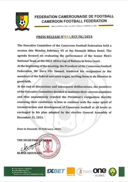 The (42)-year-old former Cameroon Legend striker Samuel Eto’o has submitted his resignation letter as the president of the Football Federation, but he is unable to leave. His resignation was rejected by the Cameroon Football Federation’s executive committee.