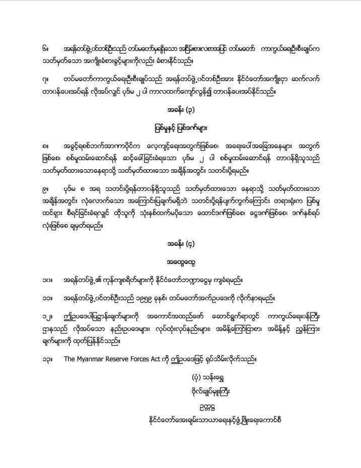 The State Administration Council issued an order on 13th February 2024 that the Reserve Force Law is now in force from February 13, 2024. That Reserve Force Law was enforced by the State Peace and Development Council in 2010. The Reserve Force law enforces that a military member must serve in the Reserve Forces for five years from the date of military discharge or retirement.
