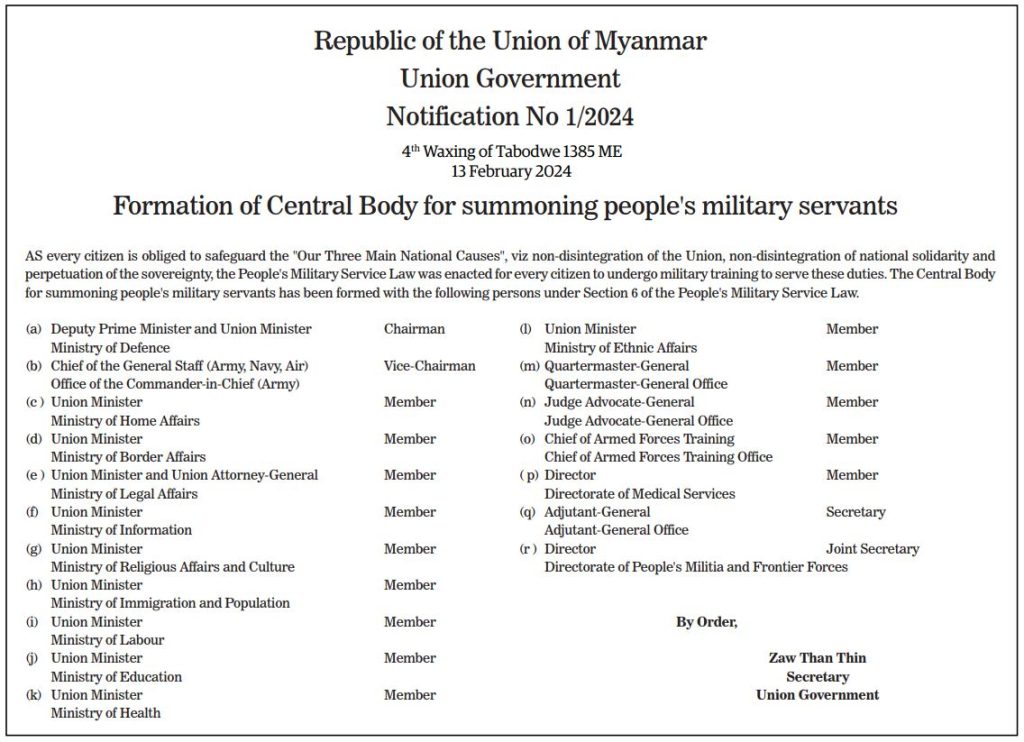 For the militia service system that will be implemented in the coming months, the formation of the Central body for summoning people’s military servants was issued by the Union Cabinet with Order No. (1/2024) on the evening of February 13th.