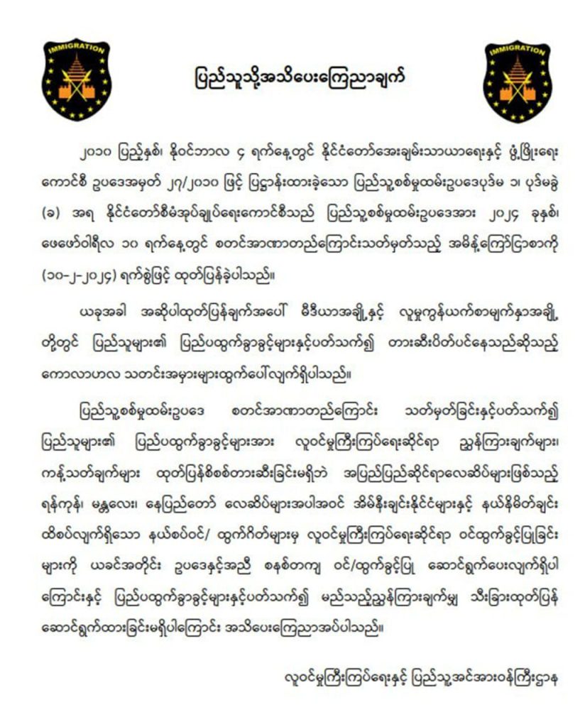 Regarding the People’s Military Service Law, the ministry allowed systematic entry/departure from border gates, bordering neighboring countries including Yangon, Mandalay, Nay Pyi Taw international airports as before by the law without issuing instructions and restrictions on immigration, and banning foreign departure permissions of people. Moreover, any instructions on foreign departure permits are not issued, according to the ministry.