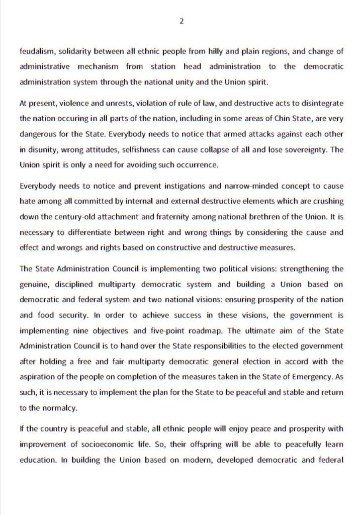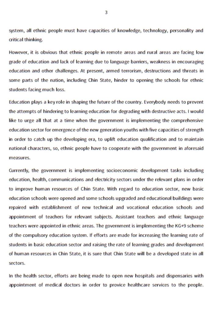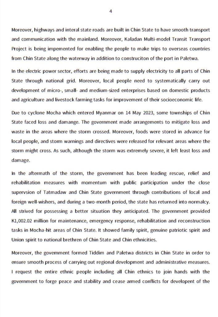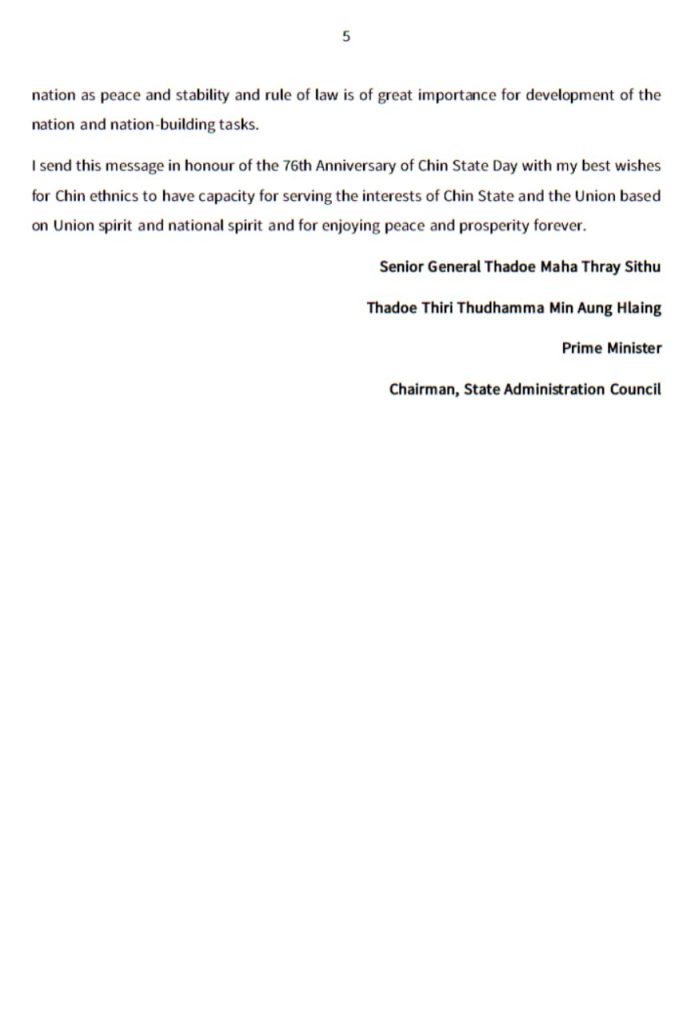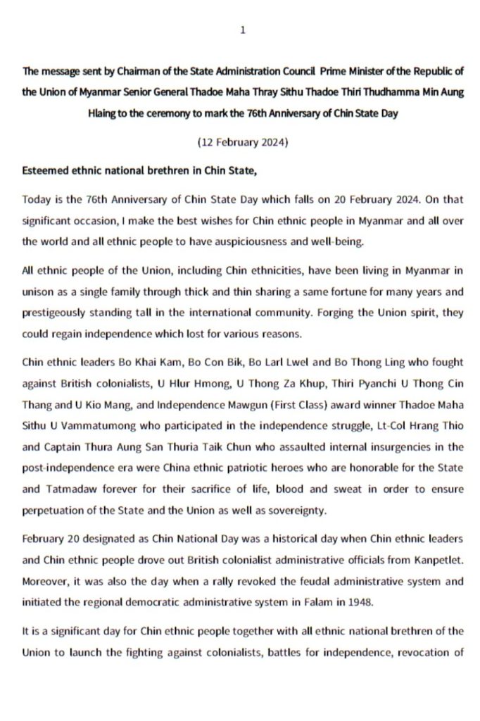 The following is the full-text translation of the message sent by Chairman of the State Administration Council Prime Minister of the Republic of the Union of Myanmar Senior General Thadoe Maha Thray Sithu Thadoe Thiri Thudhamma Min Aung Hlaing to the ceremony to mark the 76th Anniversary of Chin State Day.