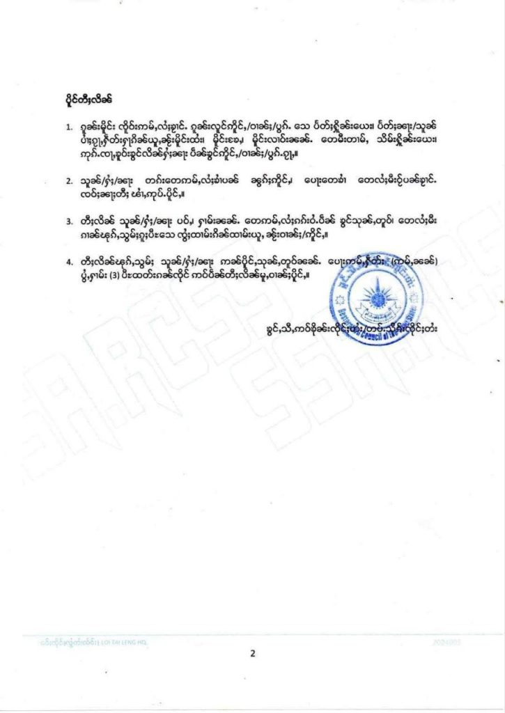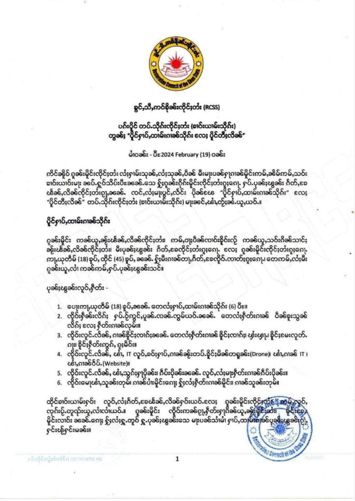 The Restoration Council of Shan State/Shan State Army (RCSS/SSA) stated in Shan Language yesterday that all residents of Shan State, between the ages of 18 and 45, must serve in the military for 6 years. Anyone who turns 18 and is under 45, regardless of gender, must serve in the military for 6 years. After graduating, have to do teaching and office work.