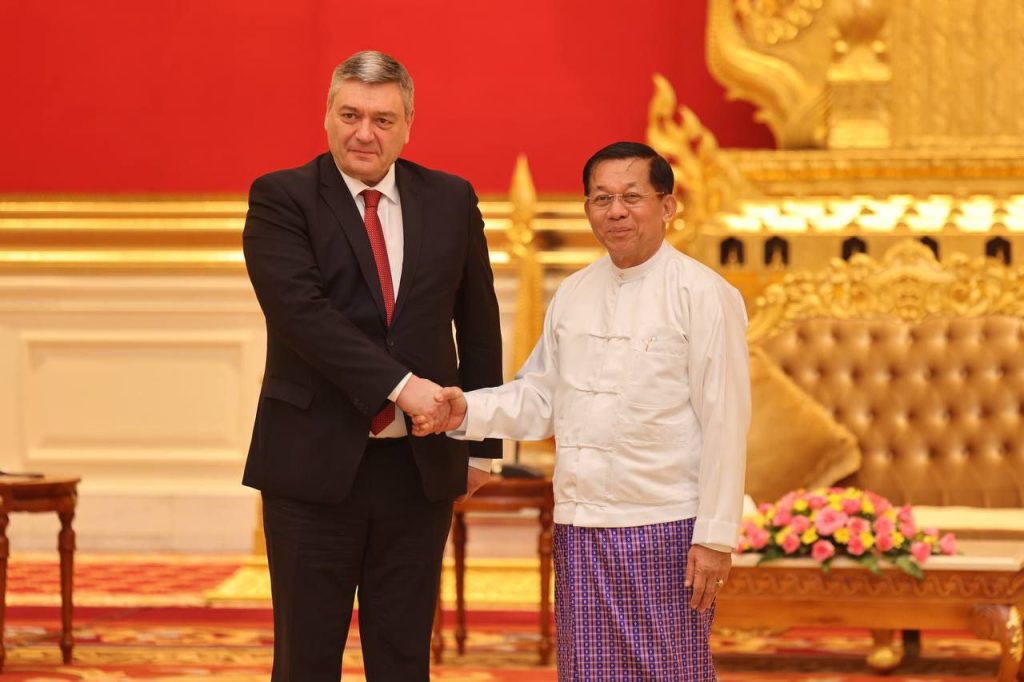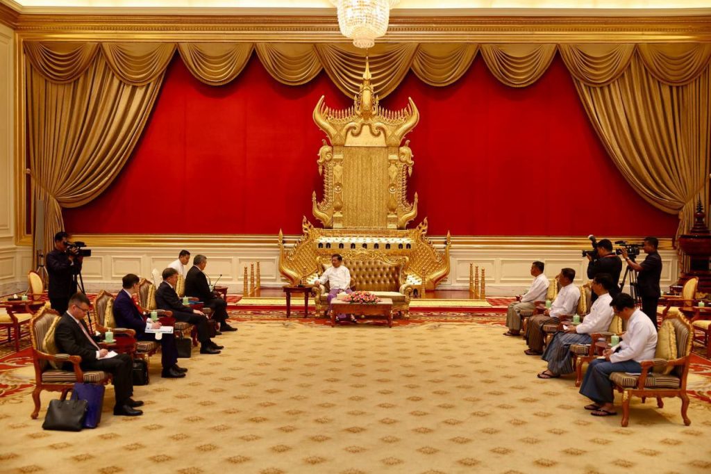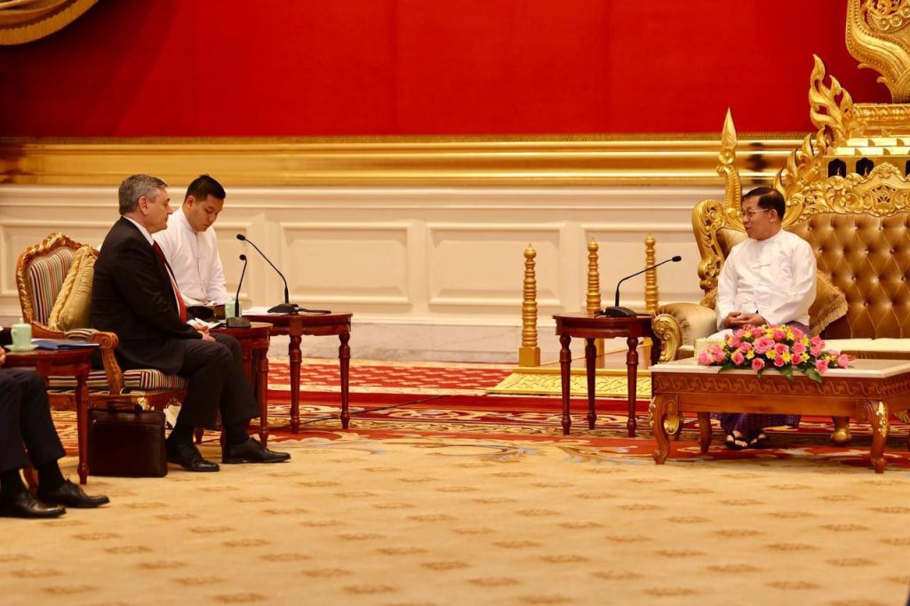 Chairman of the State Administration Council Prime Minister Senior General Min Aung Hlaing received a delegation led by Deputy Foreign Minister of the Russian Federation H.E. Mr. Andrey Rudenko at the Credentials Hall of the SAC Chairman’s Office in Nay Pyi Taw on 20 February afternoon.