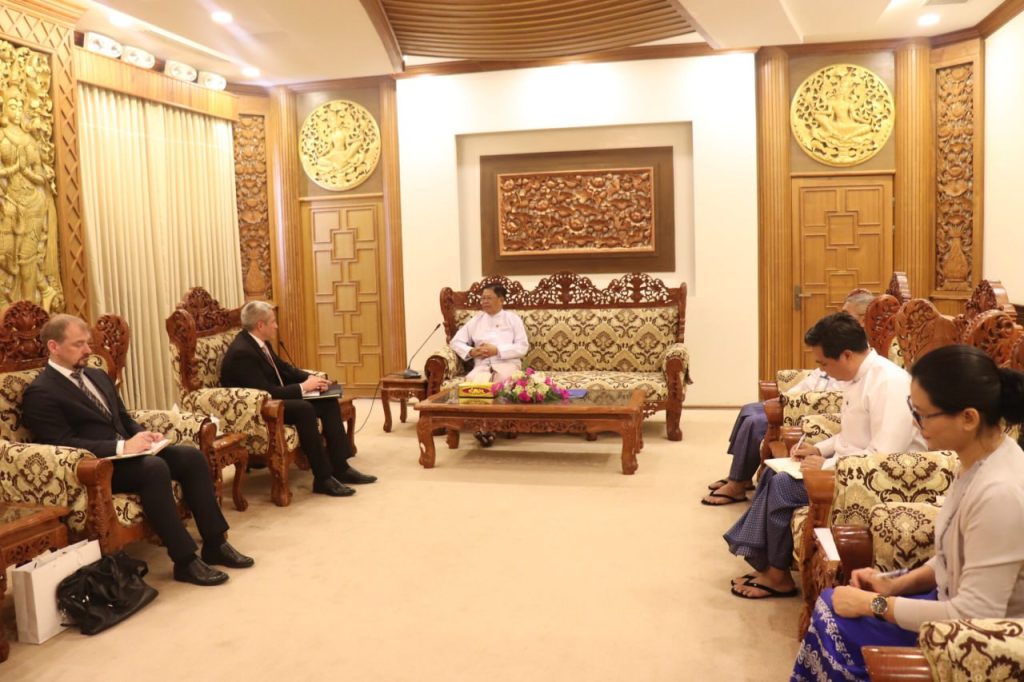 On 19 February, Deputy Prime Minister and Union Minister for Foreign Affairs H.E. Than Swe received Mr Uladzimir Baravikou, Ambassador Extraordinary and Plenipotentiary of the Republic of Belarus to the Republic of the Union of Myanmar, at the Ministry of Foreign Affairs in Nay Pyi Taw.During the meeting, they cordially exchanged views on further consolidation of the existing friendship and cooperation including activities to commemorate the 25th Anniversary of diplomatic relations between Myanmar and Belarus in September 2024, promotion of bilateral trade and facilitation of more scholarships for Myanmar students in Belarus.