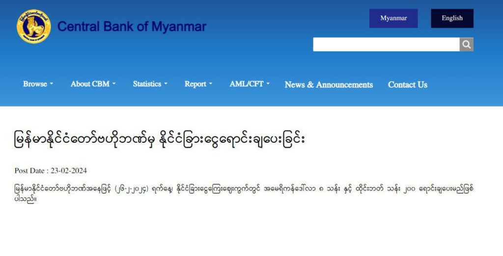 The Central Bank of Myanmar (CBM) decided to sell eight million US dollars and 200 million Thai Baht on 26 February.