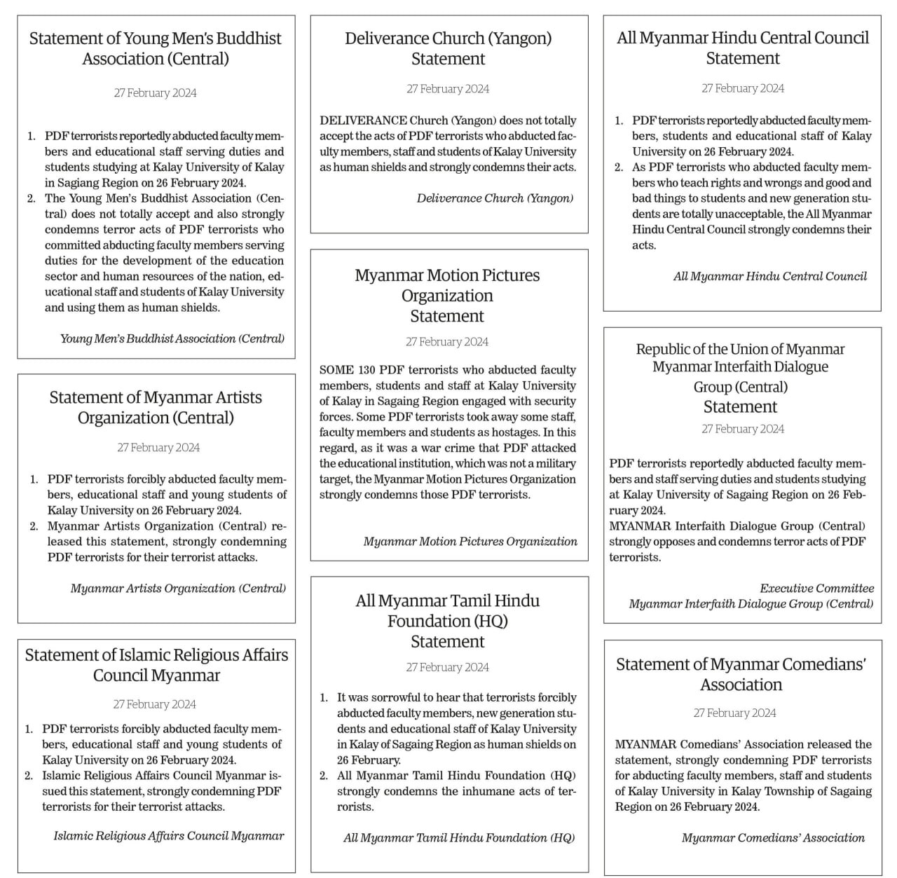 Young Men’s Buddhist Association (Central), Myanmar Interfaith Dialogue Group (Central), Myanmar Evangelical Christian Alliance, Union of Myanmar Methodist Church (Lower Myanmar), Faith Evangelical Church (Bago), Deliverance Church (Yangon), All Myanmar Hindu Central Council, All Myanmar Tamil Hindu Foundation (HQ), Thananta Dhamma Palaka (Hindu) Association, Islamic Religious Affairs Council Myanmar, Myanmar War Veterans Organization, Myanmar Press Council, Myanmar Sports Media Federation, Myanmar Motion Pictures Organization, Myanmar Music Association (Central), Myanmar Artists Organization (Central), Myanmar Theatrical Association (Central), Myanmar Comedians’ Association, Myanmar Writers’ Association, Pinnaygon Yakhine Jaame Mosque and Buthidaung-Maungtaw Regional Development Association issued statements that they strongly condemned the acts of terrorism that seriously affect the education sector, and also stated that the abduction of teachers and students for the purpose of using as human shields are totally unacceptable.