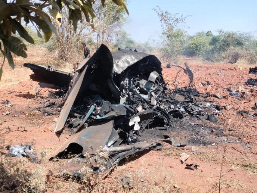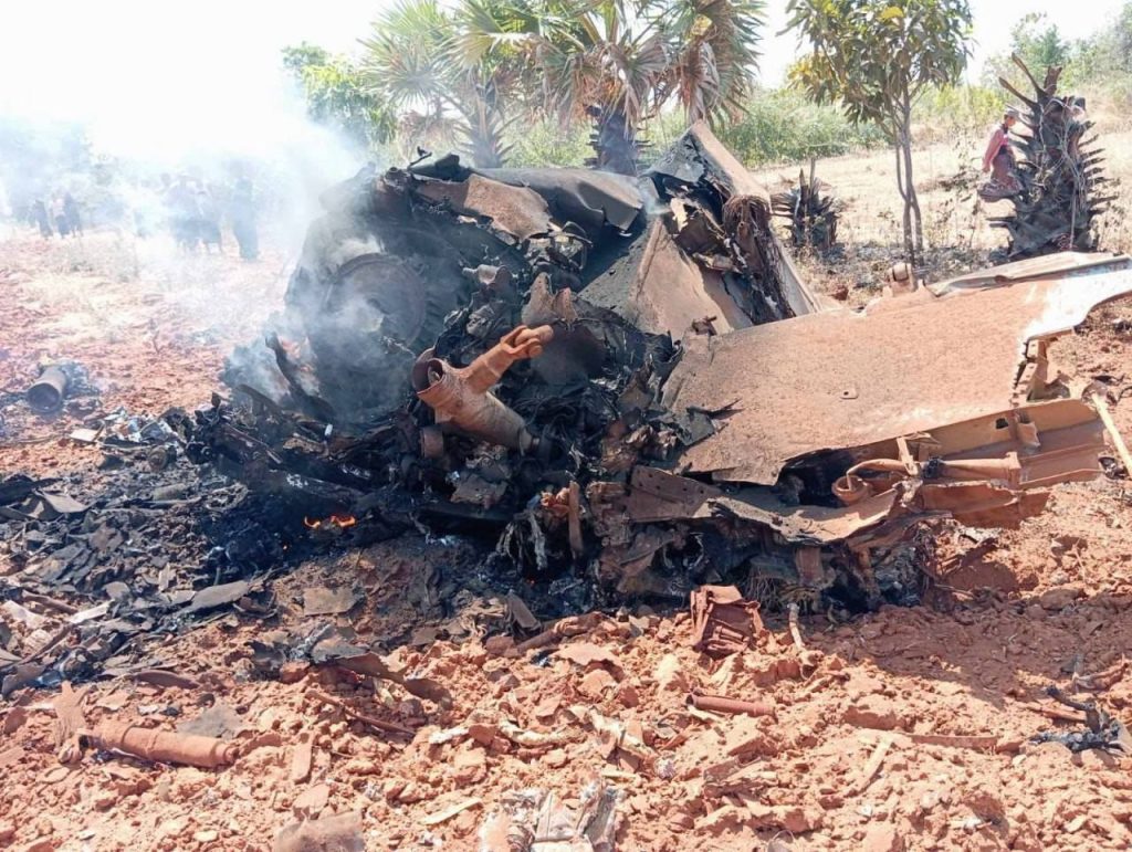 A fighter jet from the Tatmadaw (Air) crashed near Yepokgyi village, northwest of Pwint Phyu in Magway at around 12:05 pm during a training flight due to a sudden mechanical malfunction, resulting in a fire on the ground. The pilot successfully ejected in an emergency and was safely rescued. An investigation is underway to determine the cause of the engine failure.