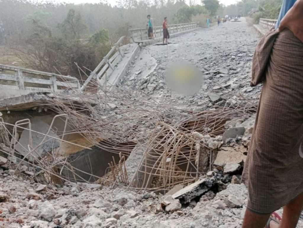 A public bridge (Pyinthar) on the road from Bilin township to Hpapun township was detonated by the terrorist group (KNU/PDF) at 6:00 am on March 6th. It is reported that Bridge No. (6/18); The length of the bridge is 120 feet. The width of the bridge is (24) feet was damaged due to a mine explosion by a terrorist group (KNU/PDF). Due to the destruction of the bridge, vehicles and people are facing difficulties. Last year, there were incidents where the KNU/PDF blew up the bridges connecting Bilin township and Thathong township.