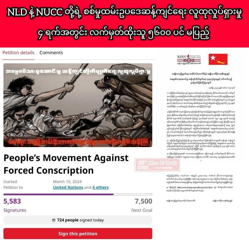 After the promulgation of the conscription law, the National Unity Consultative Council (NUCC) and the National Democratic Party (NLD) issued a joint statement to oppose this kind of military recruitment. As a public movement, only 5,583 people have signed against it in four days, and there are very few people who have signed against it.