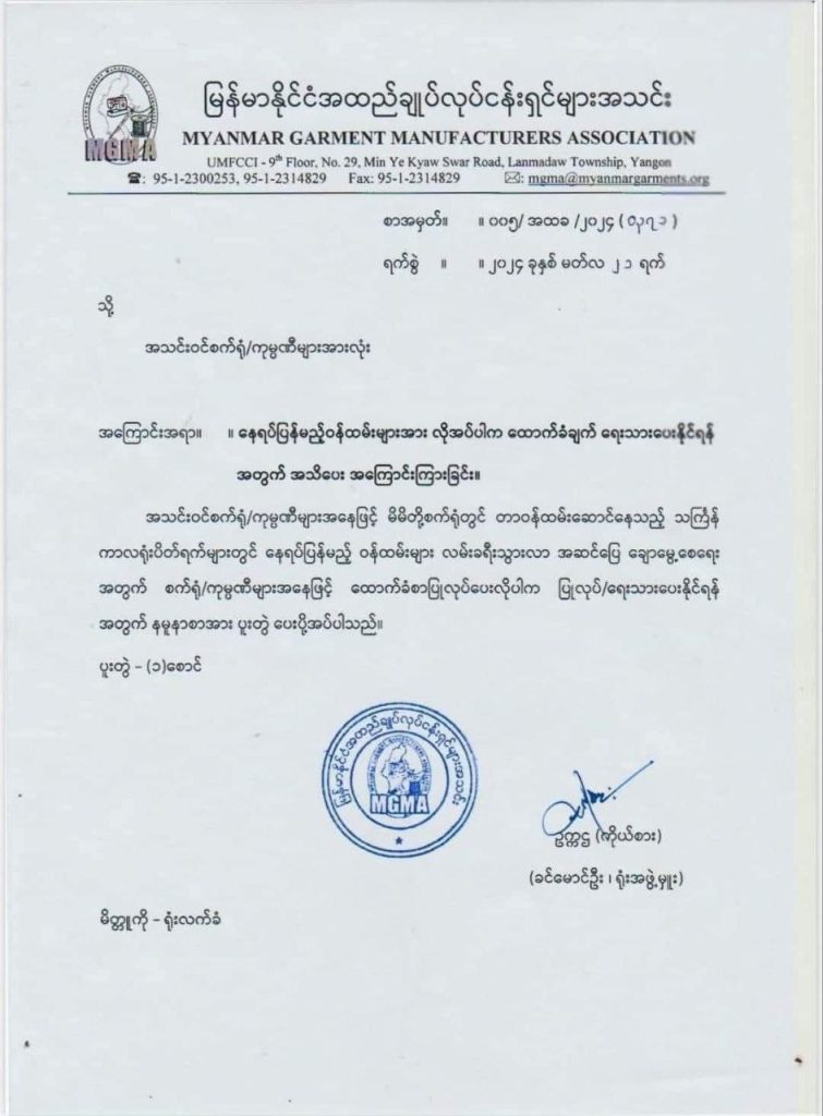 The Myanmar Garment Manufacturers Association (MGMA) announced if garment workers want to return home during the Thingyan holiday, they will be issued company letters of recommendation on March 2.