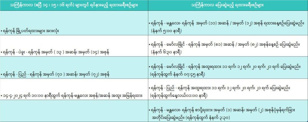 Myanmar Railways has announced that Yangon – Mandalay and Yangon – Mawlamyaing trains will run daily, during the Thingyan Festival. No. (11), No. (12)Yangon – Mandalay – Yangon express train and No. (81),No. (82) Yangon – Mawlamyaing – Yangon trains will run daily during Thingyan. Similarly, No. (1); No. (2) Yangon – Mandalay – Yangon the Post train will run as usual during Thingyan.