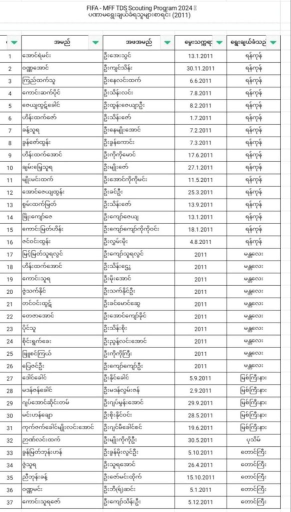 According to preliminary selection programs, Yangon – 432, Mandalay – 320, Taunggyi -196, Myitkyina -150, Pathein – 59, Bago – 48 and A total of 1,205 people were selected, and the selection teams announced the list of the winners of the preliminary stage.The final selection will be held at the Myanmar Football Academy (Mandalay) on 11 and 12 May for Upper Myanmar and at the National Football Academy (Yangon) on 15 and 16 May for Lower Myanmar.