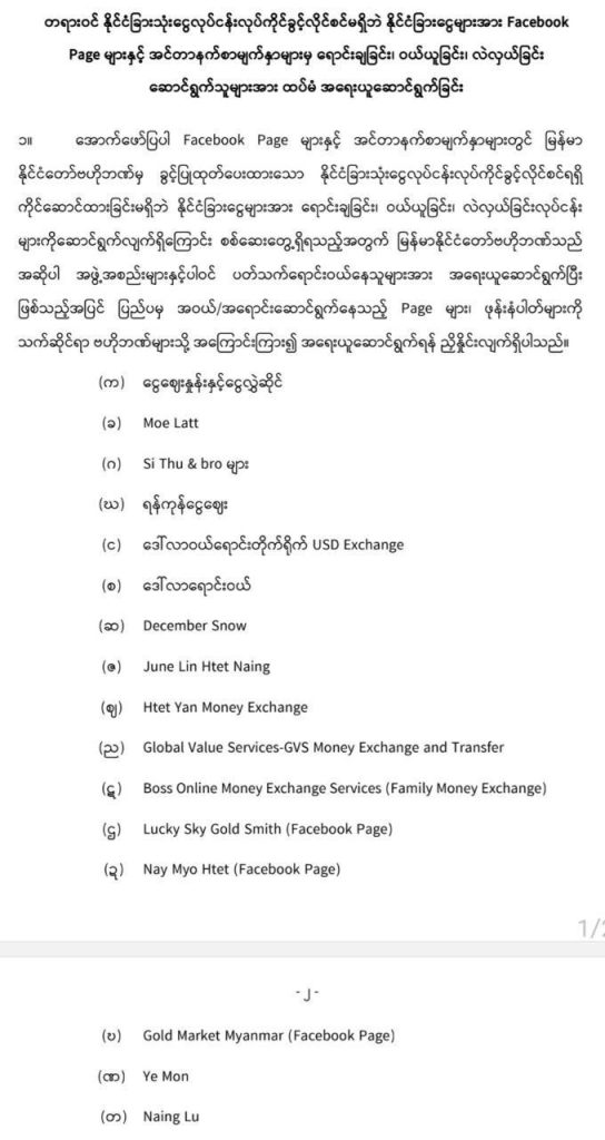 It has been announced that the Central Bank of Myanmar has taken action against (16) online pages and websites that are selling foreign currencies online without a foreign exchange business license.