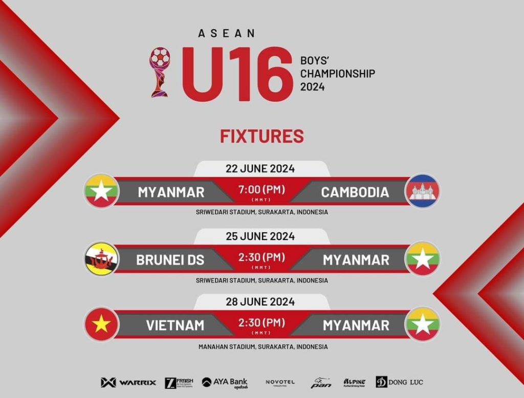 Host Indonesia is falling in the group (A) as Laos, Philippines, Singapore and In group (C) were falling Thailand, Malaysia, Timor and Australian. The Myanmar U-16 team will play as group matches against Cambodia on June 22 at 7:00 p.m., Brunei on June 25 at 2:30 and Vietnam on June 28, at 2:30 p.m. (Myanmar time).