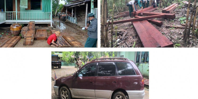 On June 16 and 17, illegal teak weighing 1.617 tonnes and illegal hardwood weighing 1.809 tonnes were confiscated in Bago and Toungoo districts. Additionally, an unregistered Toyota Caldina in Indakaw town and illegal teak weighing 3.393 tonnes, illegal hardwood weighing 3.225 tonnes, and other illegal timbers weighing 0.479 tonnes were confiscated in Toungoo District.