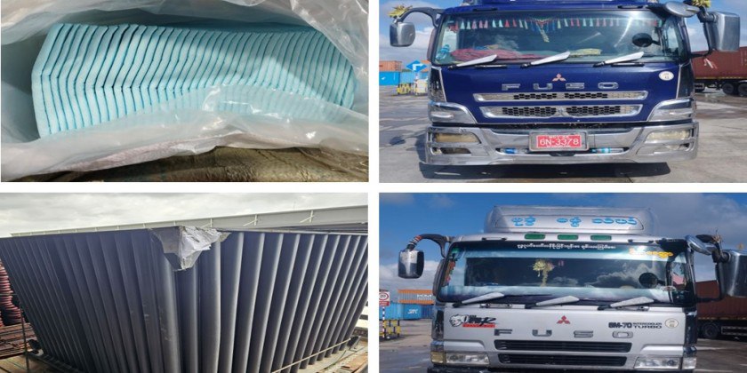On June 14, an unregistered Toyota Crown was seized at the Rampu-Kyetpoungchan junction in Myitkyina Township, Kachin State. Additionally, two Mitsubishi Fuso trucks, one heading to Yangon from Mandalay and the other from Mongla, were seized at the Ywathagyi Dry Port in Yangon Region. These trucks were carrying six types of goods, including 1,500 kilograms of single-use bed sheets.