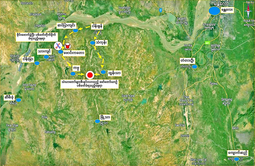 residents informed that the PDF terrorist group took a vehicle from the Pyae Sone Aung bus line running Sameikkhon-Mandalay to Phaungkataw-Thakyin area northwest of Kamma Village. So, security forces from Ngazun in two groups marched to the Phaungkataw-Thakyin area along the eastern and western routes from Ngazun to take security measures. At about more than 10 am, the security forces from the west route exchanged fire with some 20 PDF terrorists near Phaungkataw Village due to blowing up mines.