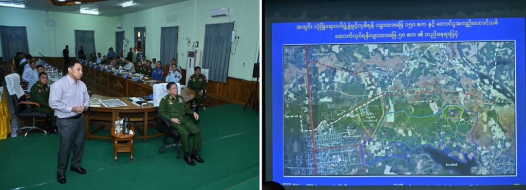 The Senior General emphasized that excavation and research on the city’s walls should be conducted systematically by experts. He stated that the restoration and preservation of city walls, gates, and bridges should be carried out in accordance with available information, prioritizing the renovation of moats and bridges. Subsequently, the city walls and royal palace sites should be maintained and restored step by step. Government buildings that need to be relocated should be moved, and designated cultural heritage sites should be preserved in accordance with the law. Regarding the construction of a new prison, he mentioned that it should be built systematically, adhering to security measures and standard guidelines. Similarly, the construction of new railway tracks and stations should be done with long-term durability in mind, ensuring quality at each stage according to the set standards. When developing new townships, green areas should be pre-planned along the roadsides to allow for tree planting. In the Taungoo region, he suggested that cultivating additional crops could bring more benefits to the area, aiming to increase agricultural output by 200 percent. Agricultural activities should follow the four principles: seeds, soil, water, and methods, to improve per-acre yields. To support food security, he mentioned the importance of rearing layer chickens and broiler chickens, as well as feeding and raising native chickens, cattle, and pigs systematically. Additionally, dairy farming should be expanded.