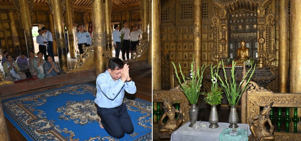 Afterward, the Senior General and wife and party paid obeisance and offered flowers and water to the Buddha image in the teak monastery, which is more than 162 years old.
