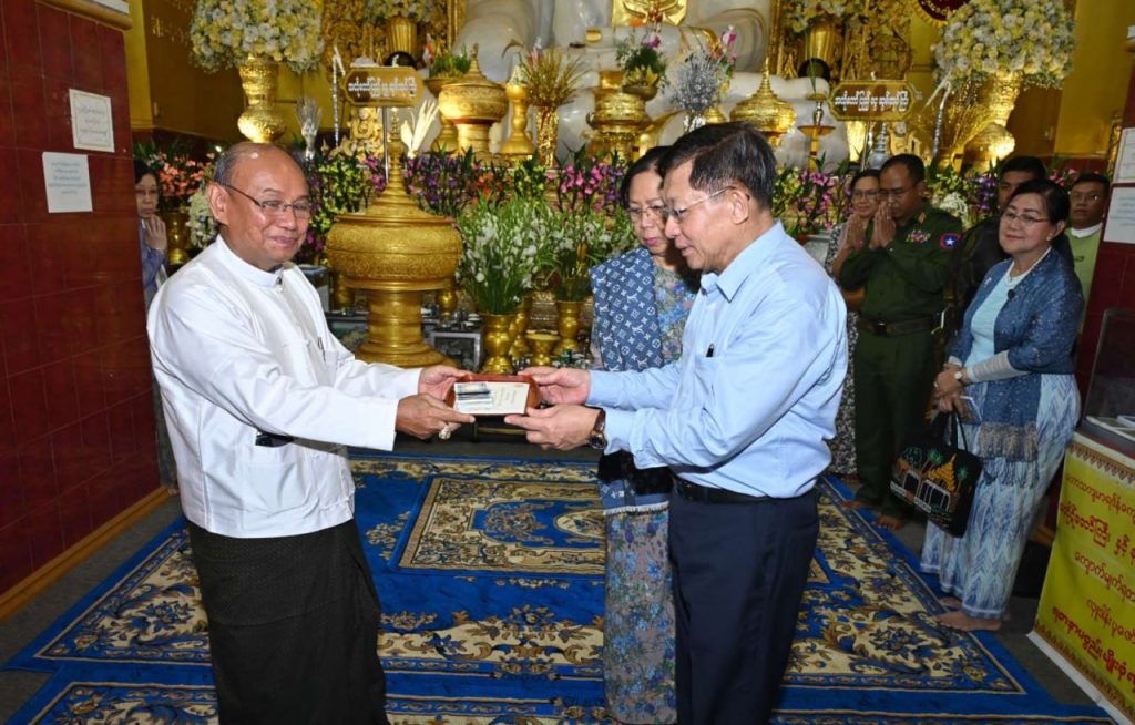 Afterward, the Senior General and wife and party continued to Maha Dhammikarama Shwekyin Main Monastery, paid obeisance to Presiding Nayaka Sayadaw Agga Maha Pandita Bhaddanta Thutivara and offered alms and the Sayadaw presented a marble Buddha image as a Dhamma gift to the Senior General and wife.