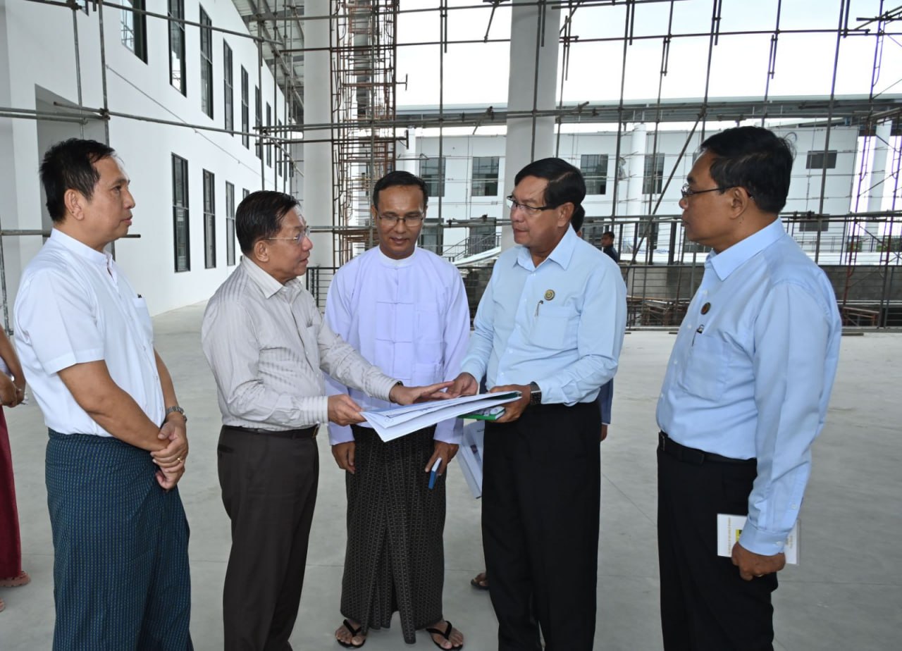 At Western Yangon Techno logical University, the Senior General and party inspected progress of new lecture hall on the campus. Rector Dr Kyi Soe, the Yangon Region Chief Minister and officials conducted the Senior General and party round the construction site.