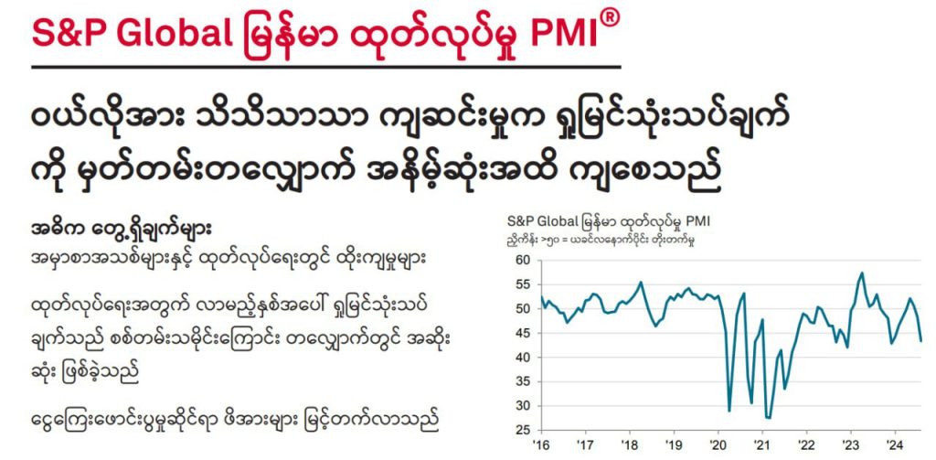 The S&P Global Myanmar Manufacturing Purchasing Managers’ Index (PMI) survey, released today, stated that due to the ongoing political situation and inflationary pressures, demand has decreased, and Myanmar’s manufacturing output has fallen to its lowest level in the survey’s history.