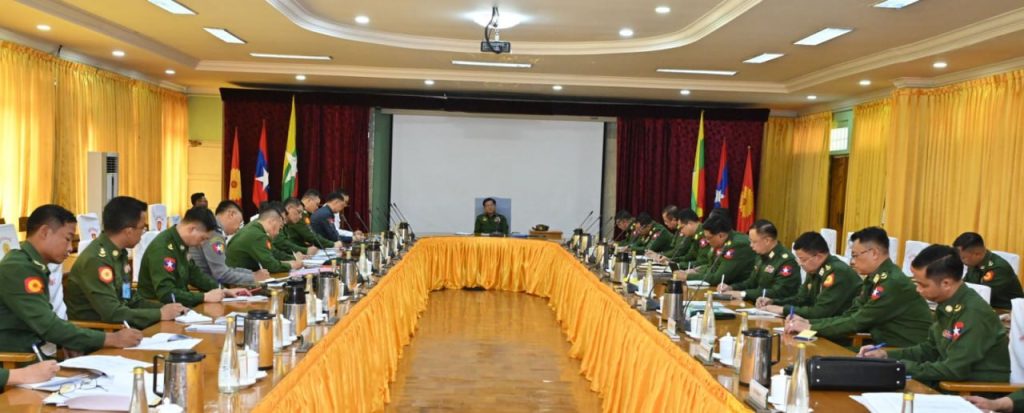 First, at the meeting hall of the Eastern Command, Commander Maj-Gen Zaw Min Latt provided a briefing. He discussed the collaboration of military personnel, Myanmar Police Force members, and members of the local People’s Militia in maintaining regional security and protecting roads and bridges.